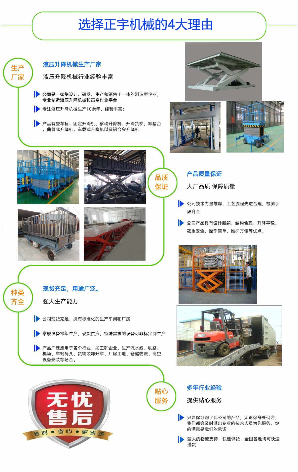 濟南正宇升降機械有限公司是一家集設(shè)計、研發(fā)、生產(chǎn)和銷售于一體的制造型企業(yè),生產(chǎn)液壓升降機械和高空作業(yè)平臺,公司處于素有泉城美稱的山東省濟南市,坐落于濟北開發(fā)區(qū)。優(yōu)越的地理位置和便利的交通給公司的發(fā)展帶來了充分的條件。正宇液壓技術(shù)力量厚,工藝流程先進合理,檢測手段齊全。目前主要產(chǎn)品有:高空作業(yè)平臺、登車橋、固定升降機、移動升降機以及鋁合金升降機等等。公司產(chǎn)品具有設(shè)計新穎、結(jié)構(gòu)合理、升降平穩(wěn)、載重安全、操作簡單、維護方便等優(yōu)點。產(chǎn)品廣泛應(yīng)用于各個行業(yè),如工礦企業(yè)、生產(chǎn)流水線、鐵路、機場、車站碼頭、貨物裝卸升舉、廠房工地、倉儲物流、高空設(shè)備安裝等場合。公司以誠信、創(chuàng)新、穩(wěn)健為宗旨,以品質(zhì)、完善服務(wù)的理念,迎接市場的挑戰(zhàn)。期待您的咨詢!